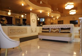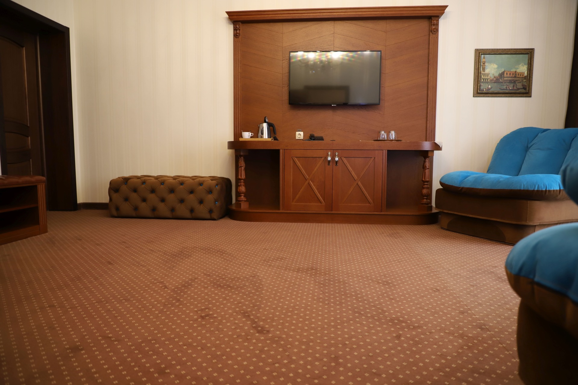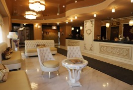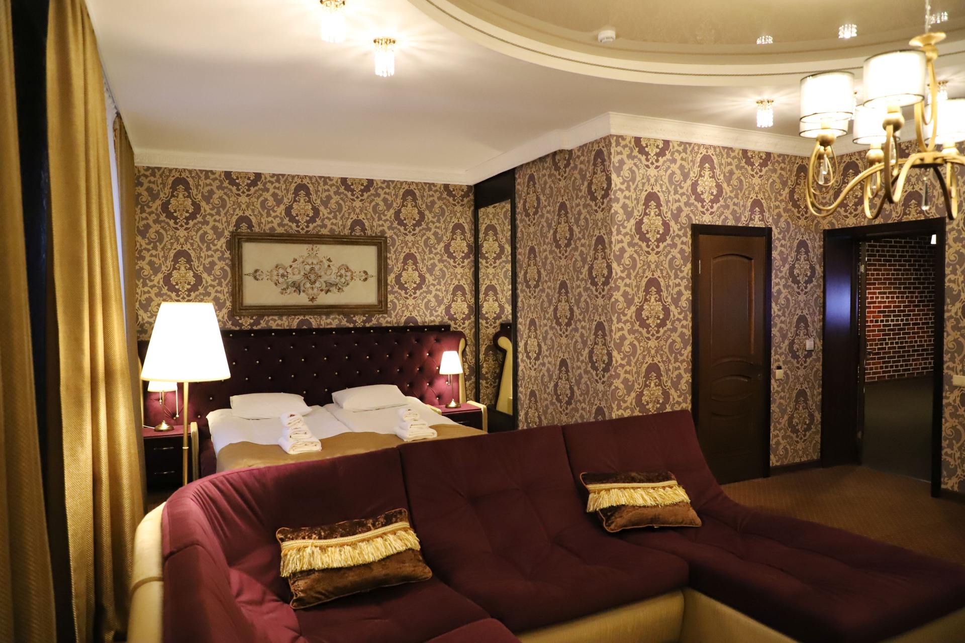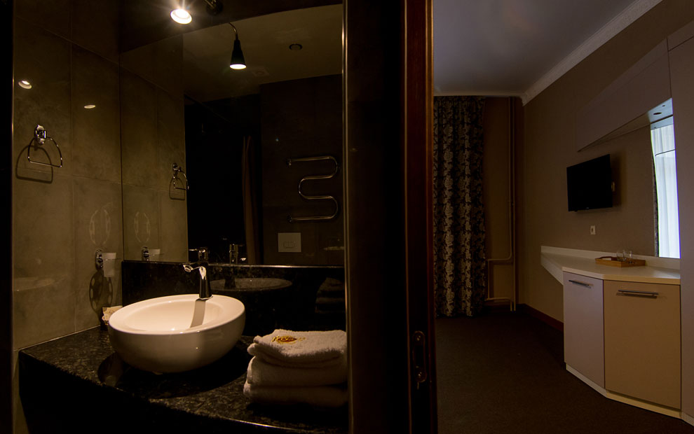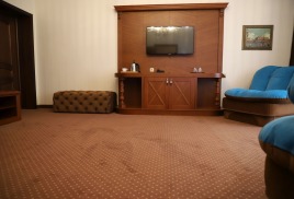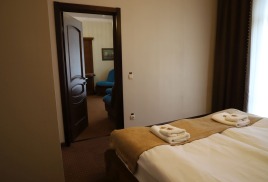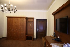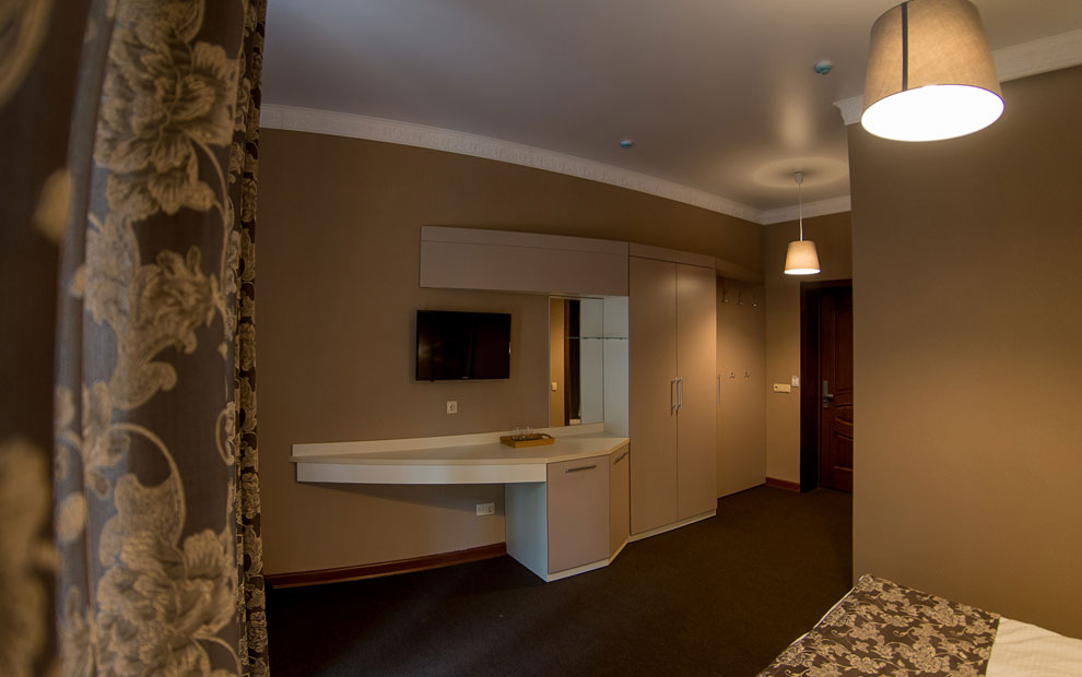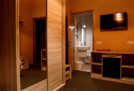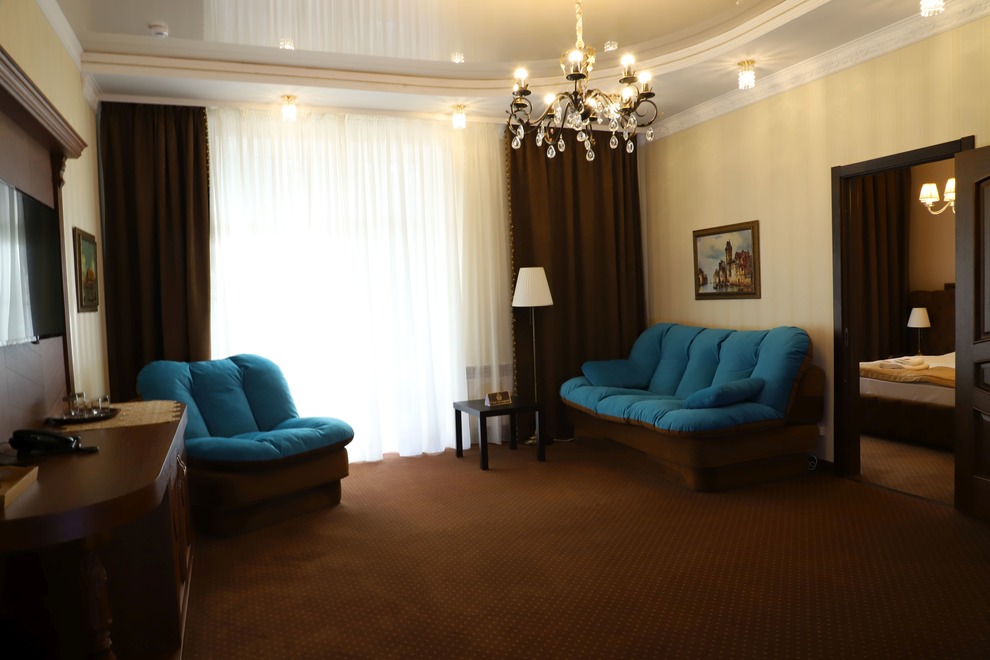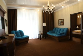 - 2-местный 2-комнатный номер Люкс. Площадь номера - 29 кв.м. В номере: спальня с двуспальной кроватью, гостиная с мягкой мебелью, телевизор, холодильник, сейф, санузел с душем, халаты.
