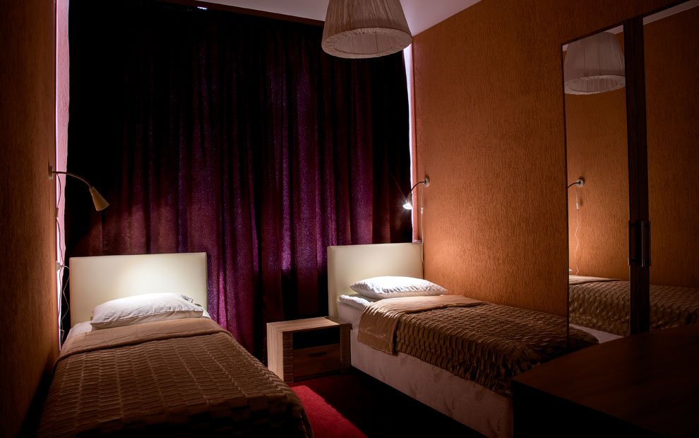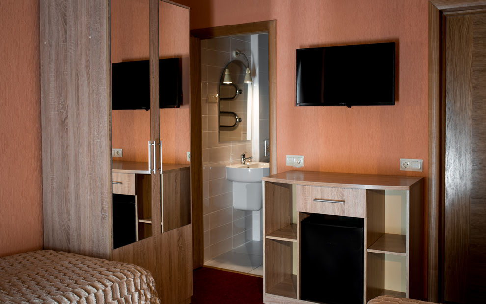 - 2-местный 1-комнатный номер Эконом. Площадь номера - 23 кв.м. В номере: две полутороспальные кровати, телевизор, холодильник, санузел с душем.