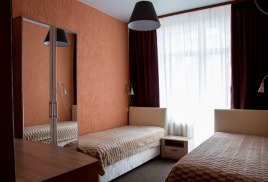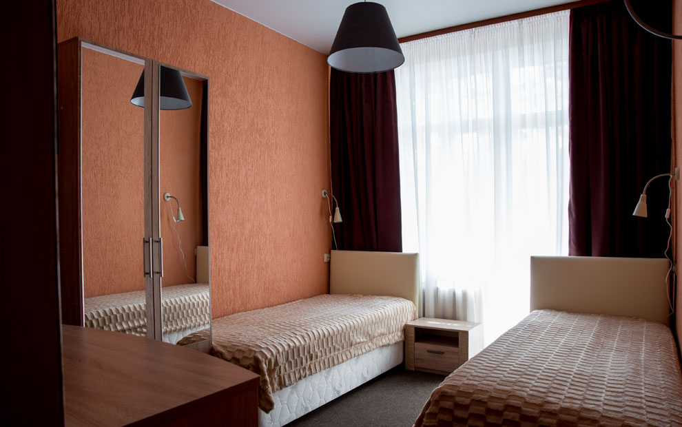 - 2-местный 1-комнатный номер Стандарт. Площадь номера - 23 кв.м. В номере: две полутороспальные кровати, телевизор, холодильник, санузел с душем.