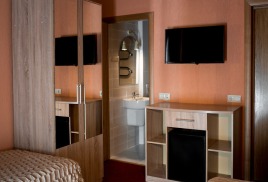- 1-местный 1-комнатный номер Стандарт. Площадь номера - 23 кв.м. В номере: полутороспальная кровать, телевизор, холодильник, санузел с душем.