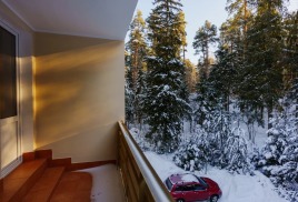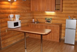 - 1 этаж: гостиная с кухонной зоной (кухонные шкафы, барная стойка, холодильник, микроволновая печь, чайник, фильтр для воды, набор посуды), диван и два кресла-кровати, домашний кинотеатр, DVD-плеер, обеденный стол со стульями, санузел (туалет, умывальник), большая веранда.