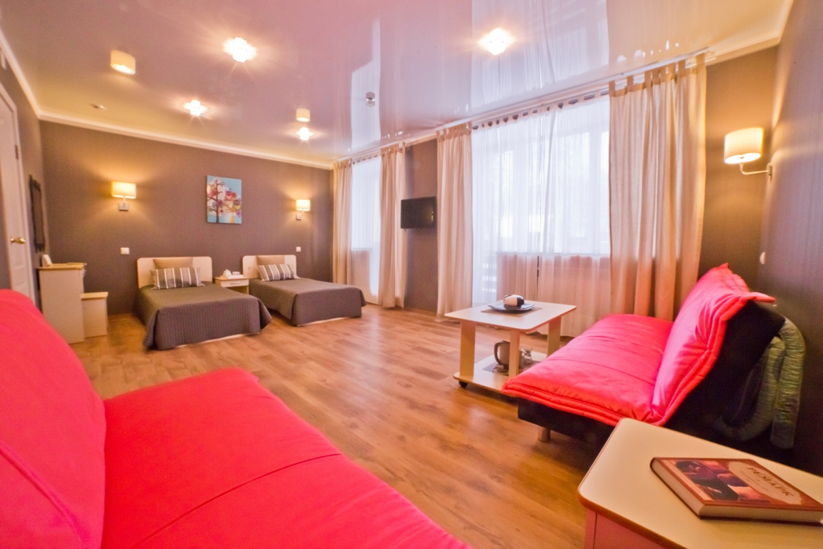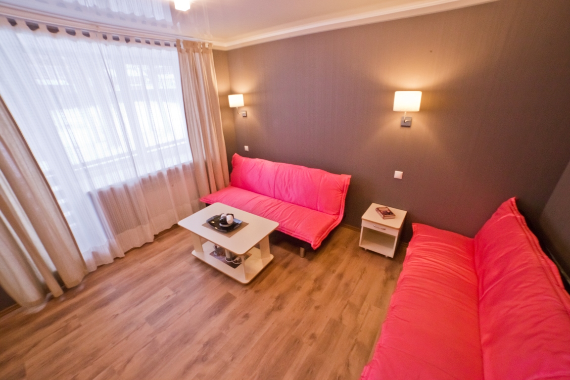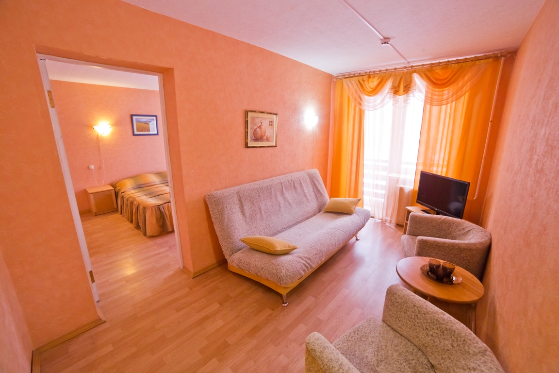 - 2-местный 2-комнатный номер Комфорт. 5 номеров. Площадь 30 кв. м.. В номере: спальня с двуспальной кроватью, гостиная с мягкой мебелью, мини- бар, телевизор, санузел с ванной, балкон. Максимальная вместимость- 4 человека , дополнительное место -диван.