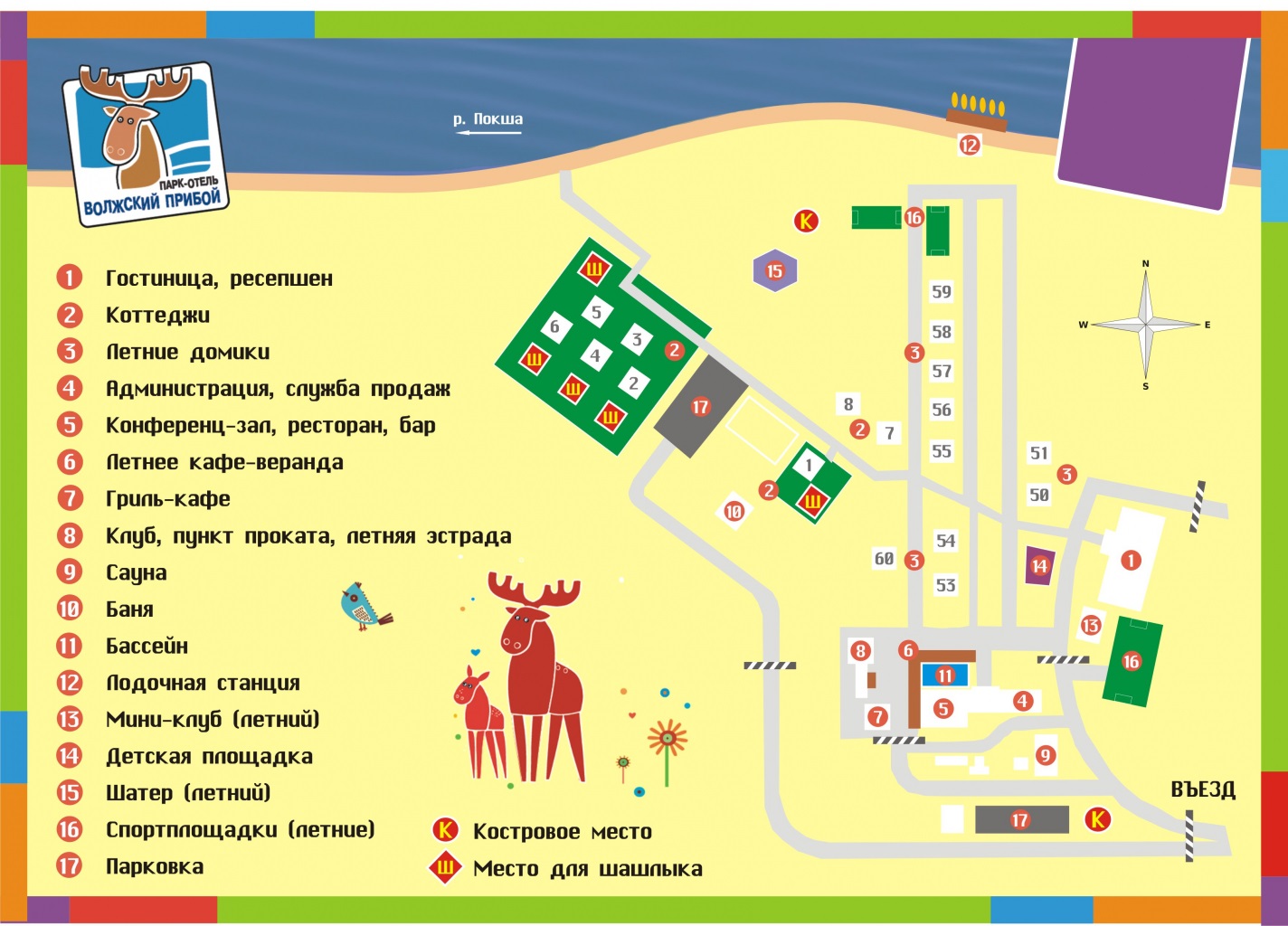 Водоем: слияние рек Волги и Покши, песчаный пляж, лодочная станция (лодки, катамараны, каяки, сёрфы).