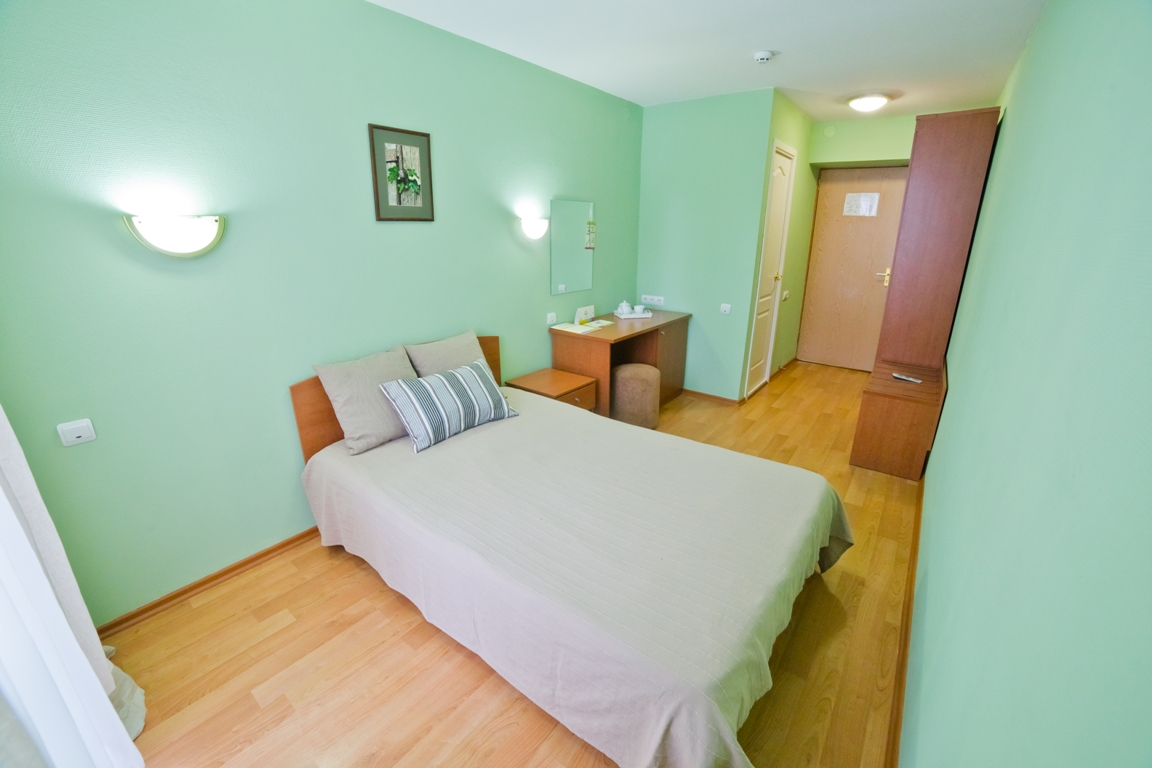 - 1-местный 1-комнатный номер Стандарт. 6 номеров. Площадь 13,5 кв. м. В номере: полутороспальная кровать, мини-бар, телевизор, санузел с душевой кабиной, балкон. Максимальная вместимость – 1 человек.