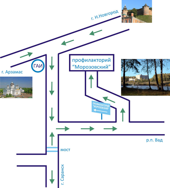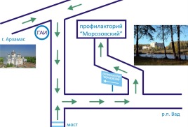 - до ж/д вокзала г. Нижний Новгород, далее на автобусе до г. Арзамас, далее на такси (10-15 минут) до профилактория "Морозовский".