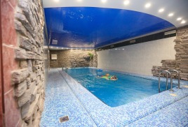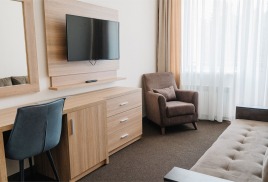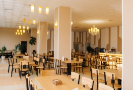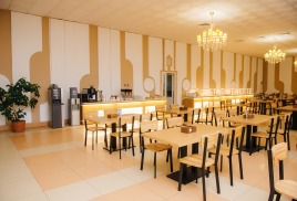 Размещение: Два корпуса: главный 5-этажное здание с лифтом. На 1-этаже лечебные кабинеты, столовая.В цокольном этаже процедурные кабинеты по водолечению, бассейн,сауны. Второй корпус-на первом этаже-конференц-зал,спортивный хал,тренажерный зал,зал ЛФК. На втором этаже 6 номеров, аренда бильярда и теннисный стол. Пять отдельно стоящих деревянных двухэтажных домов.