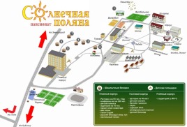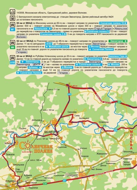 - По Успенскому шоссе до поворота на "Николину гору", далее после деревни Грязь поворот налево на Звенигород. В Звенигороде доехать до Т-образного перекрестка и повернуть налево и по указателям через Москву-реку примерно 500 метров до первого поворота направо (указатель). Далее ехать прямо (приблизительно 18 км) до пансионата "Солнечная поляна".