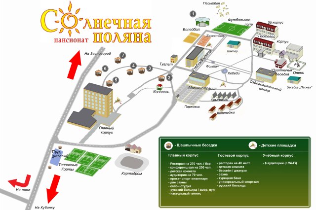 Расположение: Пансионат "Солнечная Поляна" расположен рядом с городом Звенигород на охраняемой территории в 22 га. Пансионат "Солнечная Поляна" находится в сосновом лесу на берегу Москва-реки, с благоустроенным пляжным комплексом.