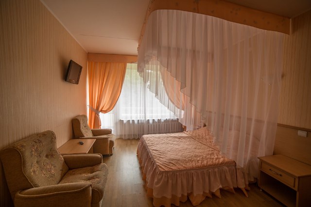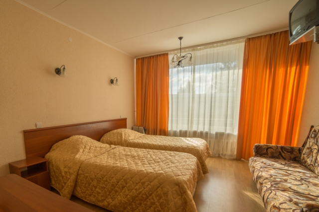 - Однокомнатный (стандартный). В номере: две кровати, диван-кровать раскладной, журнальный столик, телевизор, телефон, ванная комната (совмещенный санузел), холодильник, лоджия.