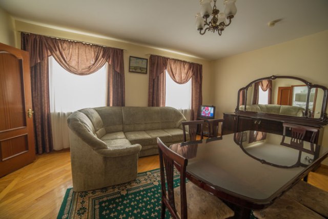 - Двухкомнатный номер с большой гостиной. В номере: в спальне двуспальная кровать, большая гостиная проходная с диваном-кроватью, стол, стулья, холодильник, телевизор, телефон, эл. чайник, ванная комната (ванна).