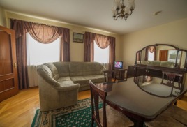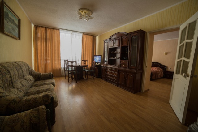 - Трёхкомнатный. Это проходная гостиная и 2 спальные комнаты, 2 ванные комнаты (совмещённый санузел) - в одной ванна, в другой - душевая кабина, холодильник, лоджия. В гостиной мягкая мебель (диван-кровать раскладной), телевизор, стол, стулья, телефон. В одной спальной комнате двуспальная кровать, телевизор, в другой - 2 полутораспальные кровати, телевизор.
