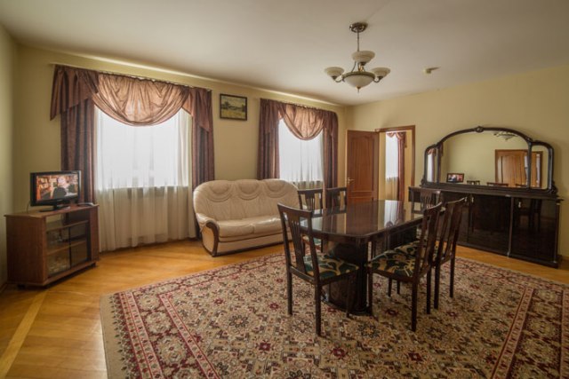 - Трехкомнатный номер с большой гостиной. В номере: две спальни - в каждой двуспальная кровать, большая гостиная проходная с диван-кроватью, стол, стулья, холодильник, телефон, телевизор, эл. чайник, ванная комната (ванна.)