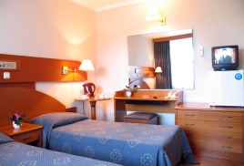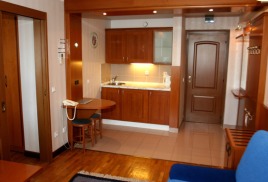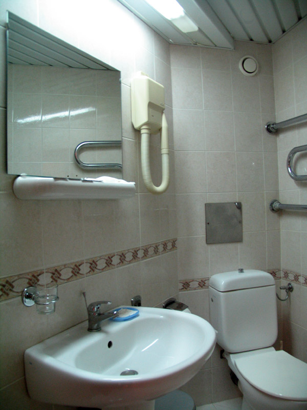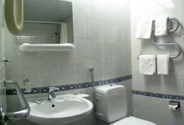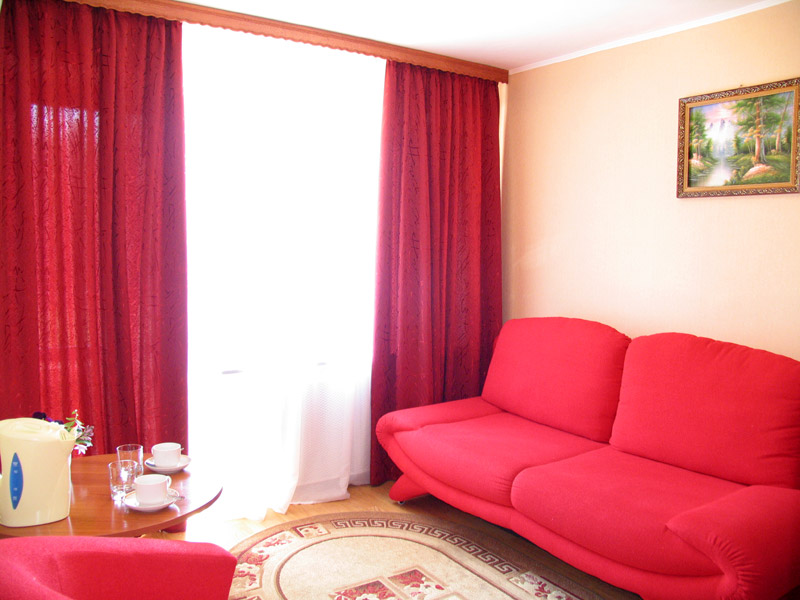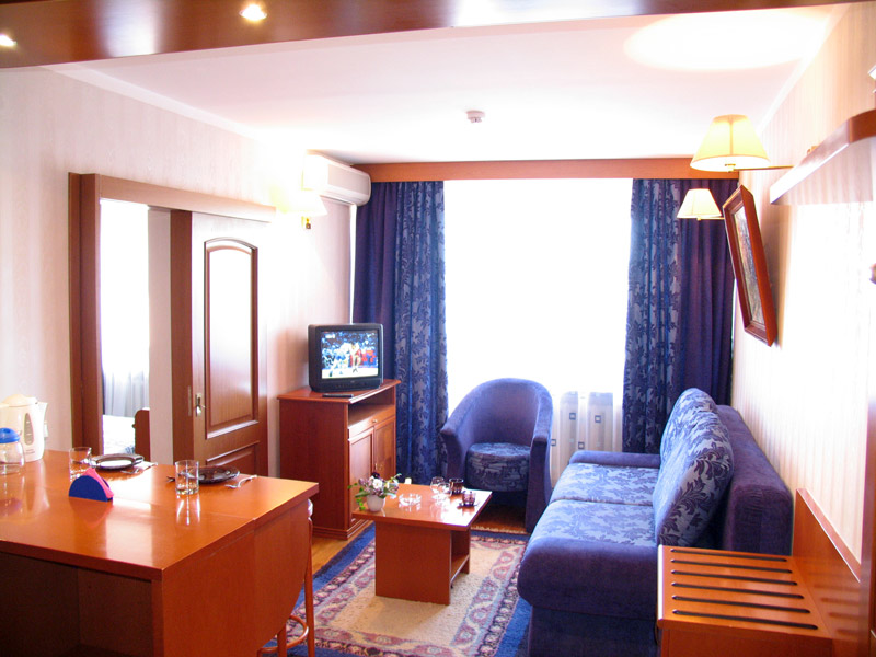 - Комната: две 1,5-спальные кровати, тумбочки, бра, коврики, туалетный столик, два встроенных платяных шкафа, ТВ, кондиционер, холодильник, радио, выход на балкон (летняя мебель).