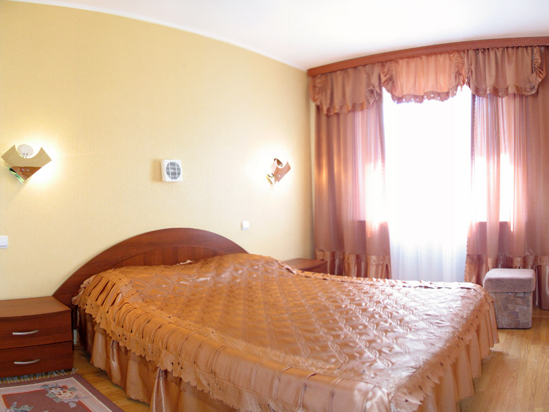 - Спальня: 2-спальная или две 1,5-спальные кровати, тумбочки, бра, коврики, туалетный столик, два встроенных платяных шкафа, кондиционер, радио, выход на балкон (летняя мебель).