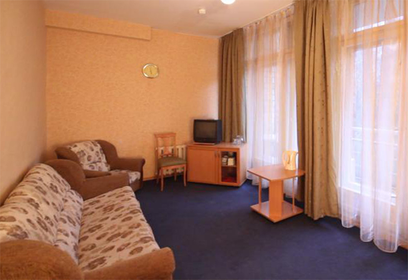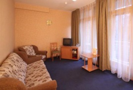 - 2-х местный 1-но комнатный / 2-х комнатный полулюкс. Площадь номера: 20-40 кв.м. В номере: мягкая мебель, обеденный стол, две отдельные или одна двуспальная кровать, чайник, тумбочки, стулья, холодильник, телевизор, санузел с душевой кабиной, фен.
