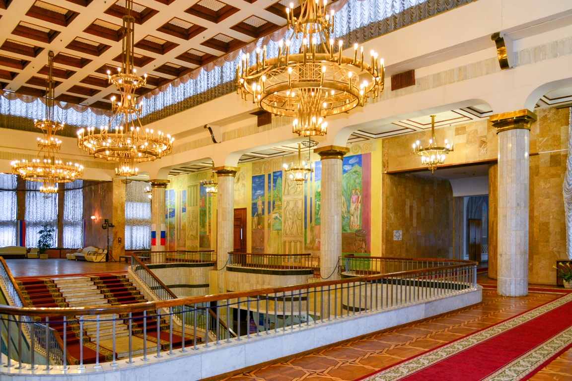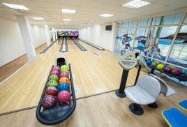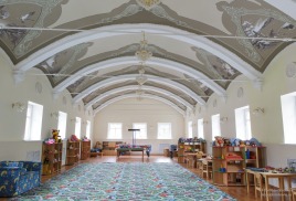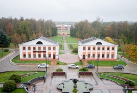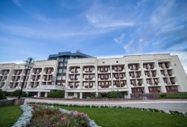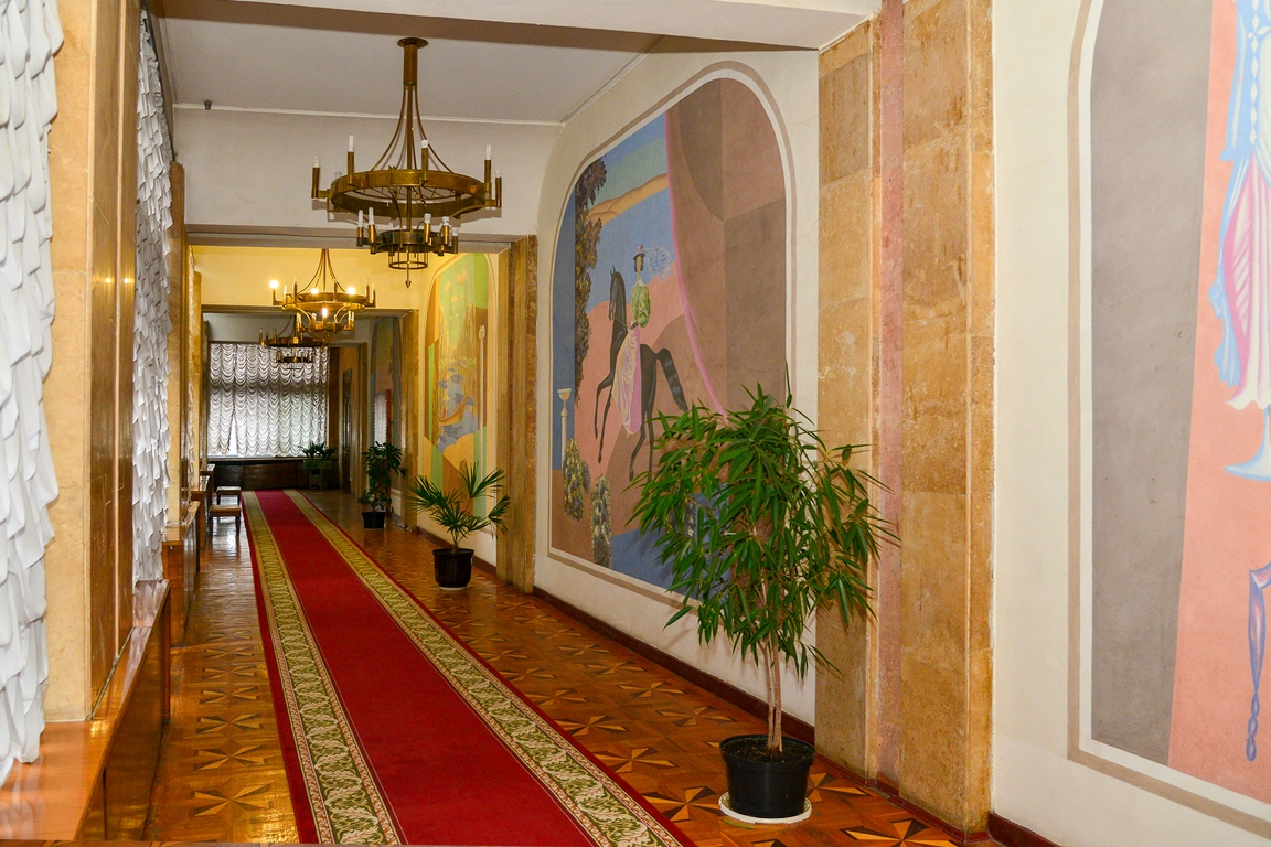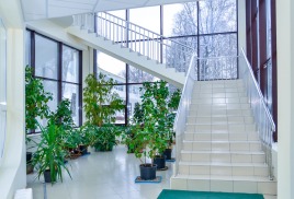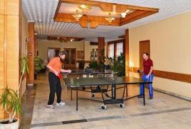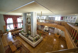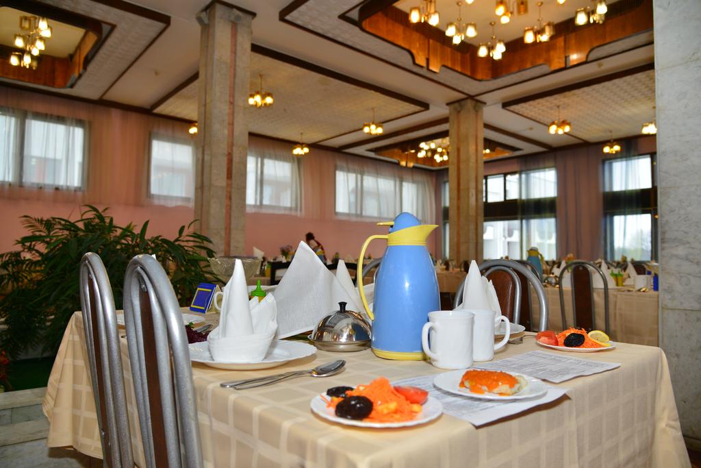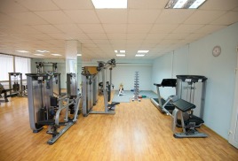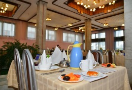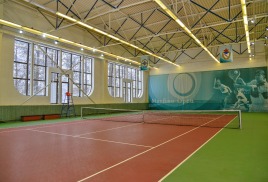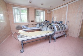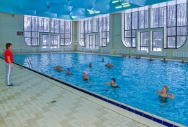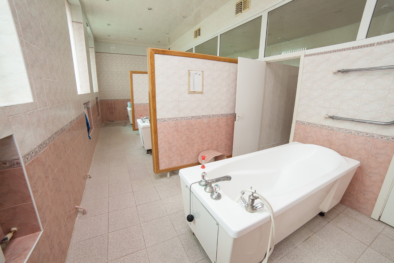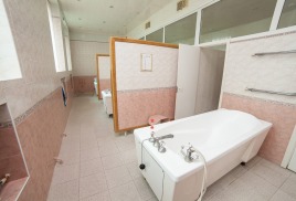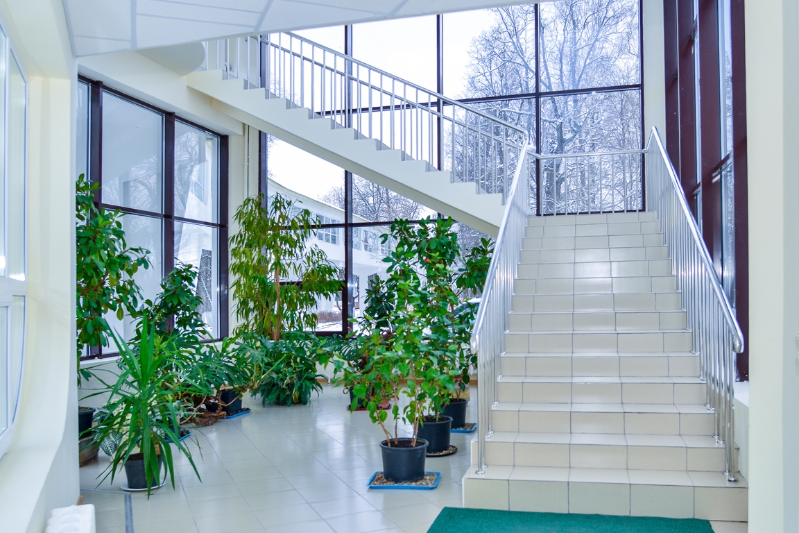 Размещение: Четыре 5-ти этажных спальных корпуса с лифтом (А, Г, Д, Е) соединены теплым переходм со столовой (корп. Б и Ж) и лечебным корпусом (корп. В).