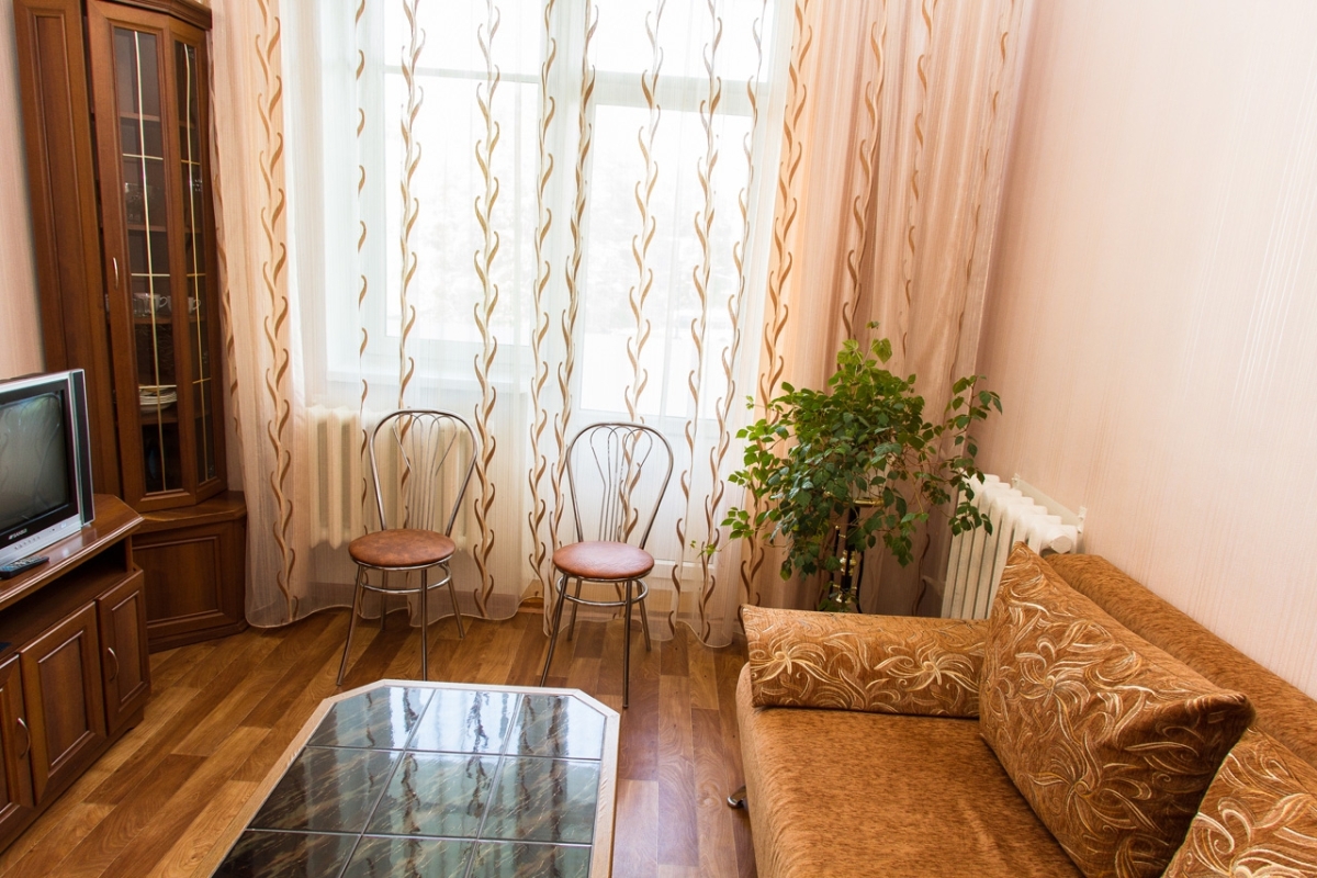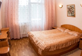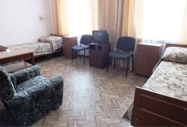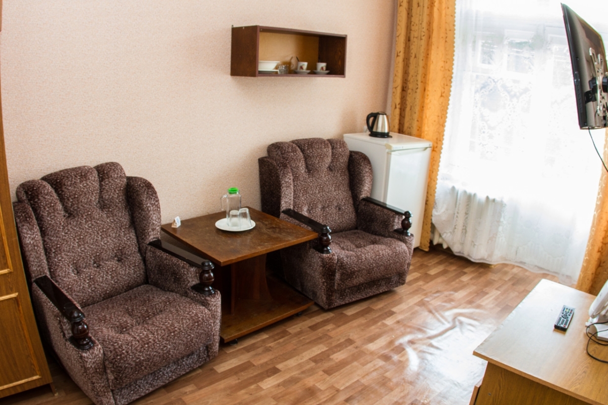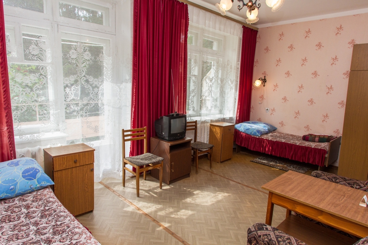 - 1-местный 2-комнатный номер. В номере: спальня с двуспальной кроватью, гостиная с мягкой мебелью, телевизор, холодильник, душ, туалет, умывальник. Номер до ремонта, без балкона.