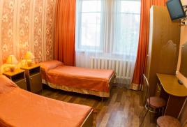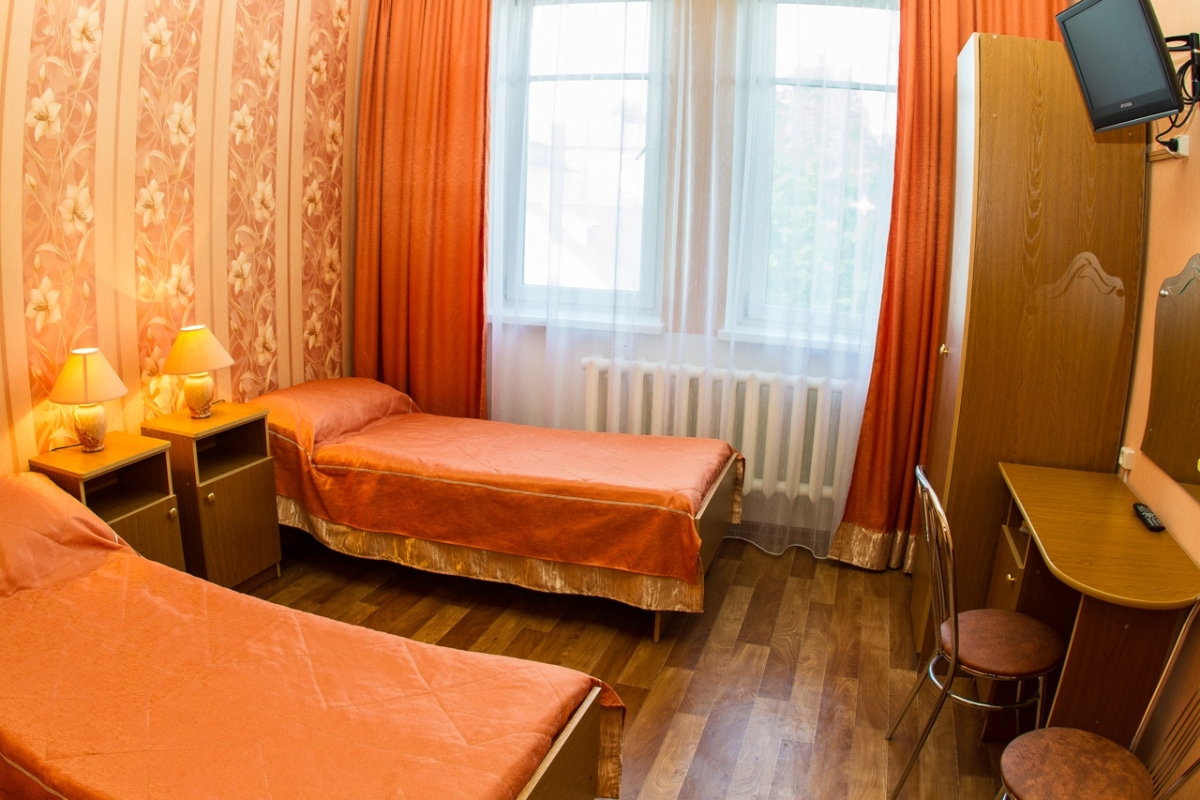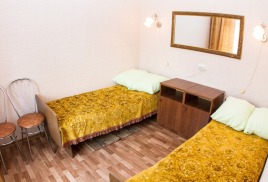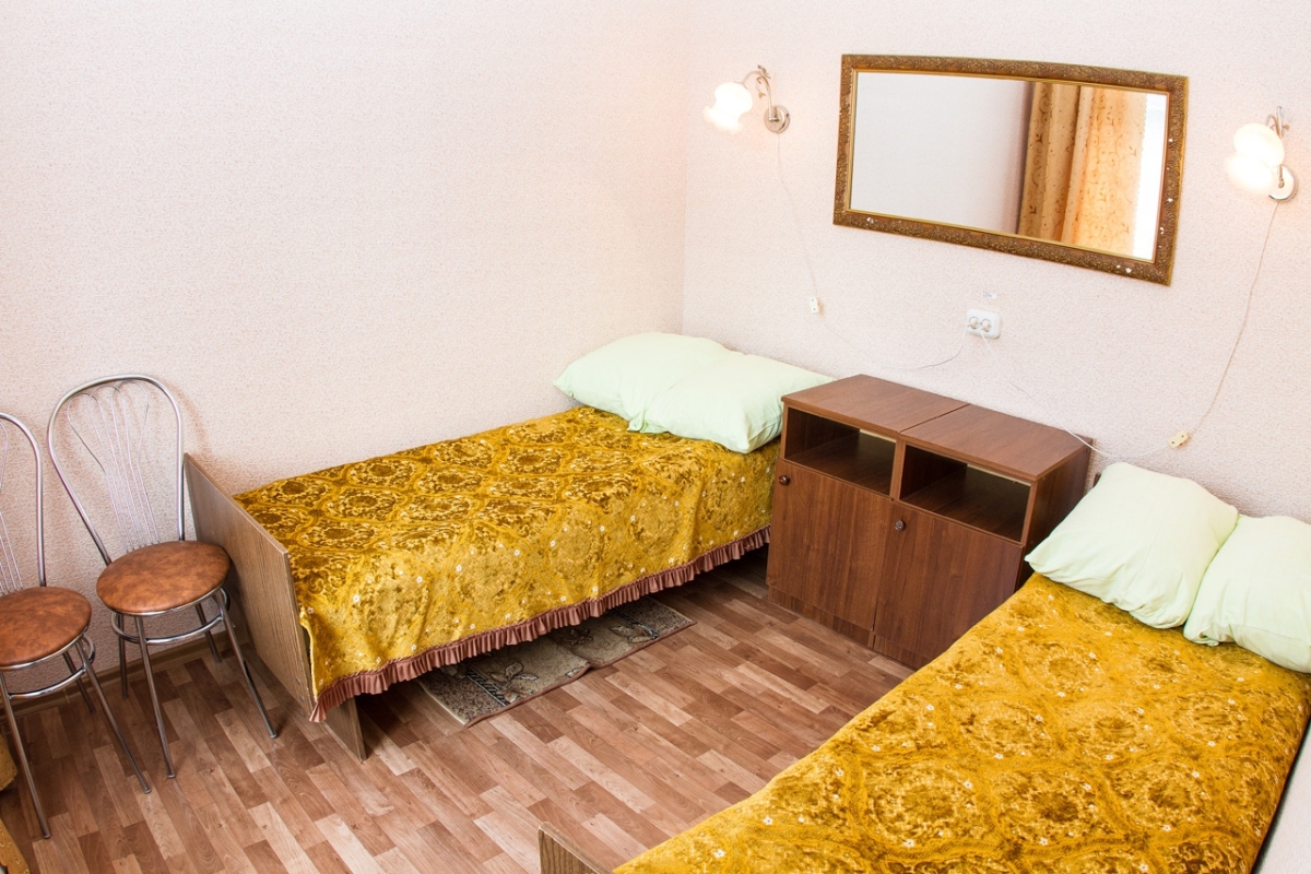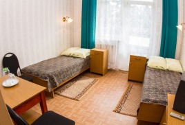 - 2-местный 1-комнатный номер. В номере: две односпальные кровати, телевизор, душ, туалет, умывальник. Холодильника нет.