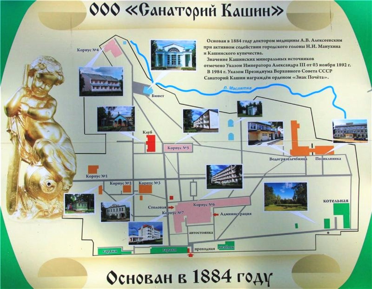 Санаторий "Кашин" расположен в экологически чистом районе Тверской области, в 200 км от Москвы, в старинном городе Кашин. На территории находится парк 10,8 га (липы, ели, березы), терренкуры (1 маршрут 1900 м), 8 глубинных скважин с минеральной водой.