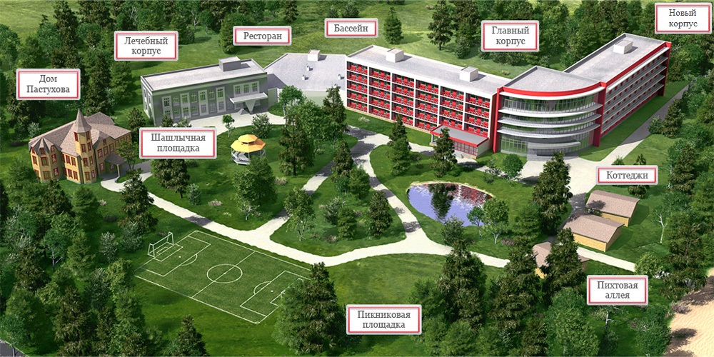 Размещение: два спальных корпуса с лифтом, соединены теплыми переходами между собой, а так же с бассейном, рестораном и лечебным корпусом. Отдельно стоящие здания Дом Пастухова, Финские коттеджи и коттедж "Семейный".