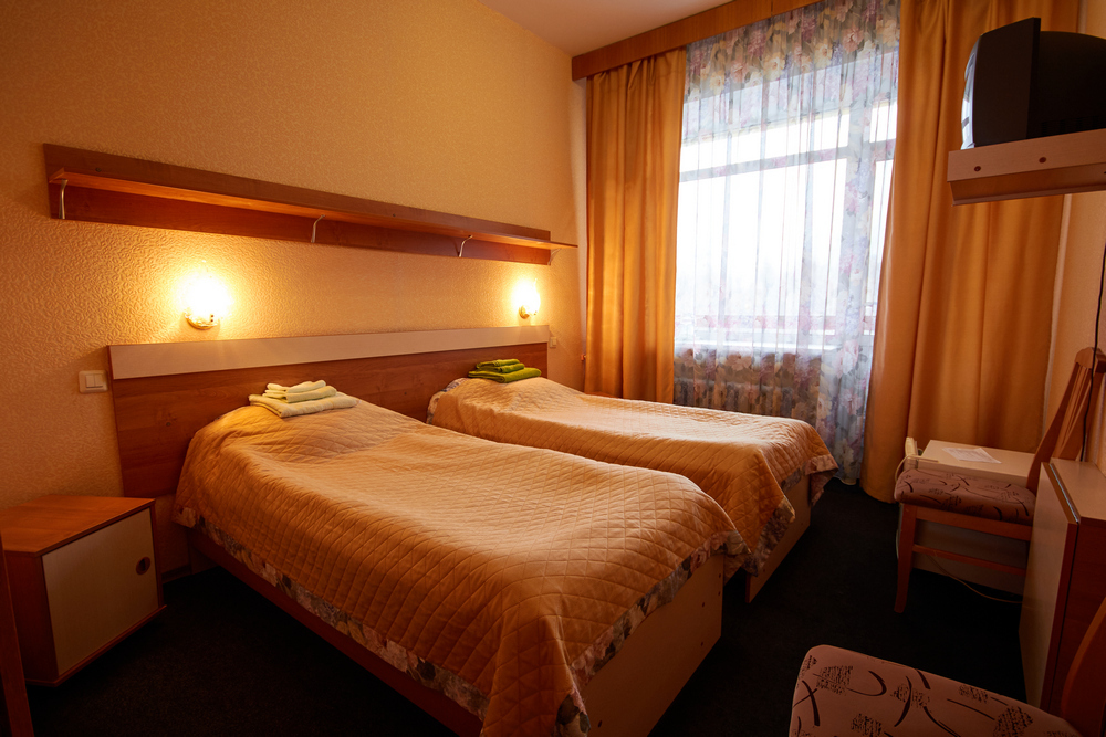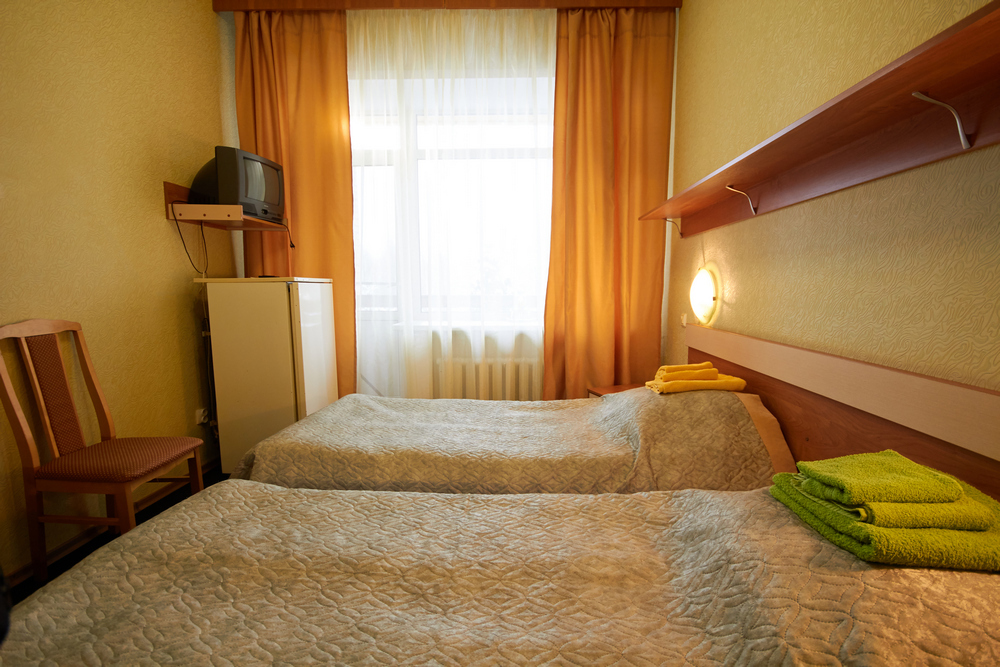 - 2-местный 1-комнатный Стандарт. В номере: две односпальные кровати, телевизор, холодильник, санузел с душем, балкон.