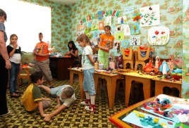 - детская комната с воспитателем (в летний период), детский городок, оборудованный качелями, горками, песочницами, каруселью