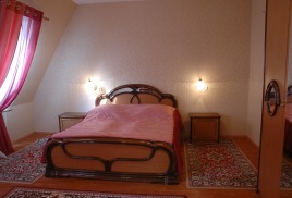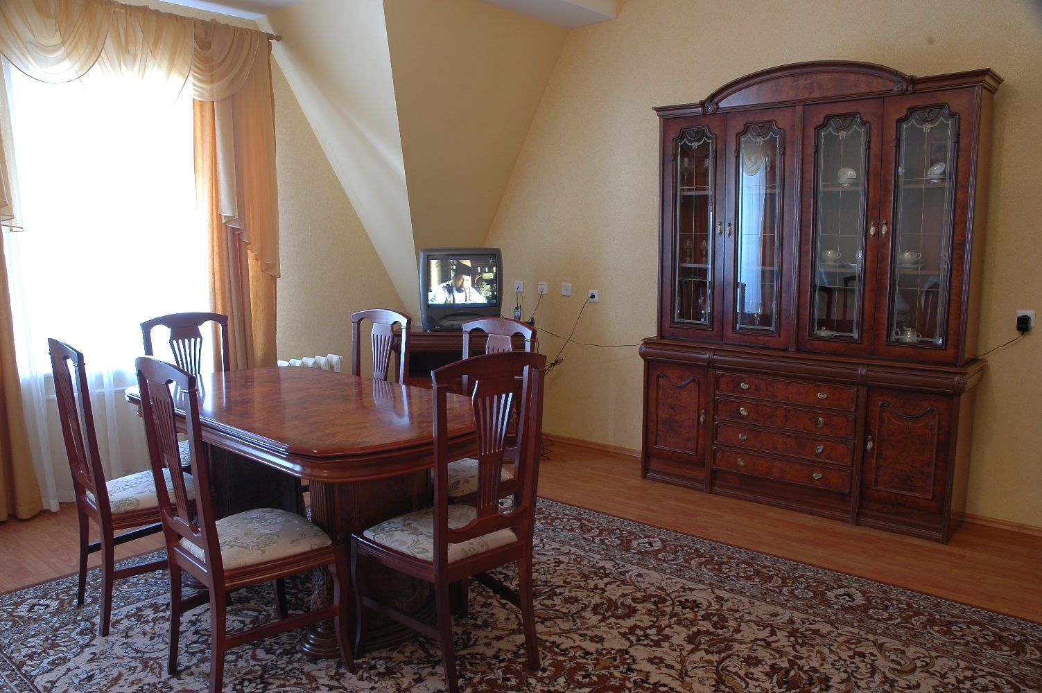 - 2-местный 4-комнатный номер "Апартаменты". Площадь номера: 108-122 кв.м. В номере: 1 или 2 спальни с двуспальной кроватью евростандарта, гостиная с мягкой мебелью, телевизор, кухня: холодильник, СВЧ-печь, посуда, кабинет, санузел с джакузи, туалет, умывальник, биде, фен, комплект полотенец, банный халат, тапочки. Номера расположены на мансардном этаже.