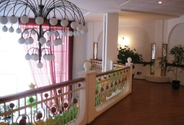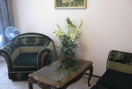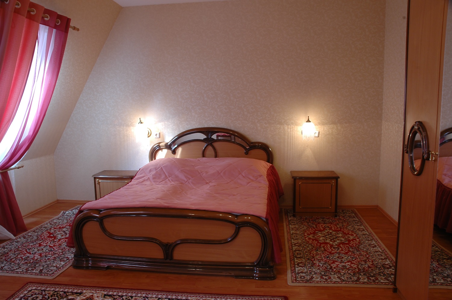 - 2-местный 2-комнатный "Люкс". Площадь номера: 32.5 кв. м. В номере: спальня с двуспальной кроватью, гостиная с мягкой мебелью, телевизор, холодильник, чайник, комплект полотенец, банные халаты, балкон, санузел с ванной-джакузи, туалет, биде, фен Номера расположены на 3 этаже.
